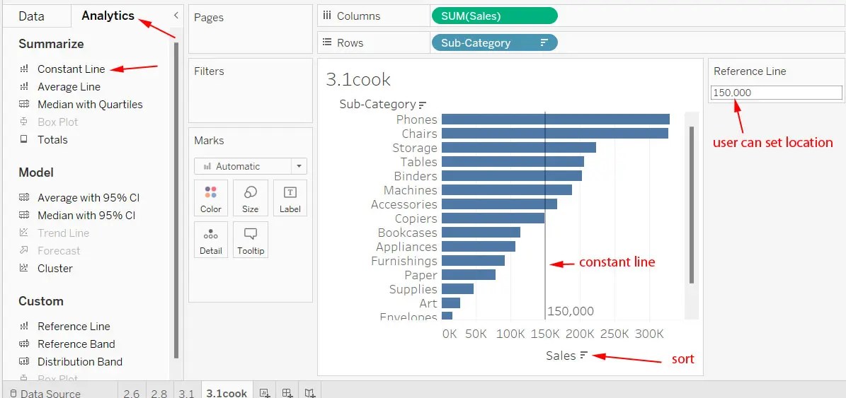To create the reference line (constant line), click the analytics tab and drag the Constant Line over onto the visualization. Type a number into the small popup box and press Enter. You can leave it as-is, unless you want to change it into a user-controlled reference line.