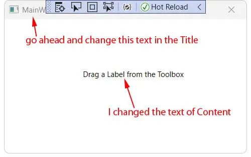<Label Content="Drag a Label from the Toolbox" Name="myLabel" HorizontalAlignment="Left" Margin="120,74,0,0" VerticalAlignment="Top"/>