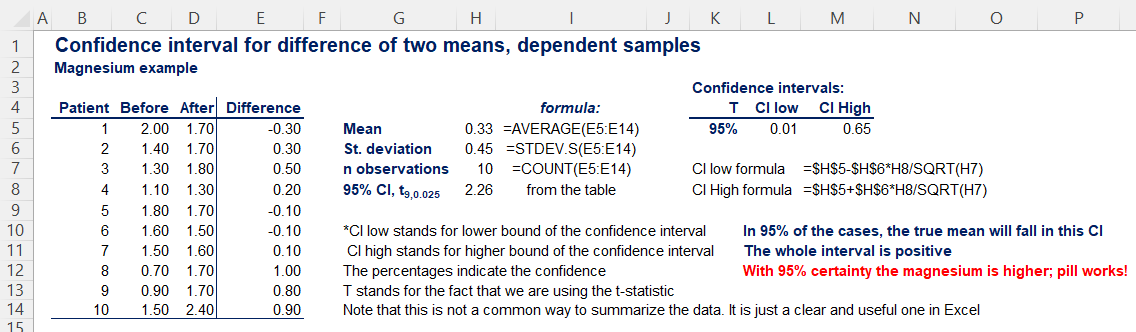 Here’s an example from the Udemy.com course Statistics for Data Science and Business Analysis where we consider the effectiveness of a magnesium supplement. We’ll look at the before and after blood tests. Healthy people have between 1.7 and 2.2 mg per deciliter (dL). We would have our list of people in one column, the before column, the after column, and the new difference column. We could just use the Student’s T statistic and calculate it just like we had a single population.