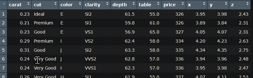 The best way to learn data frames is to jump in and work with them. That’s why R packages have several datasets that are built right in. Diamonds, for example, is a preloaded dataset in the ggplot2 package that is part of the tidyverse. If you haven’t already done so, install the tidyverse with install.packages(tidyverse). Once installed you will need to load it into your session. Run library(tidyverse) and then library(ggplot2). Now run data(“diamonds”). Add this data frame to our data viewer with the command View(“diamonds”).