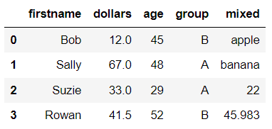 <class 'pandas.core.frame.DataFrame'> RangeIndex: 4 entries, 0 to 3 Data columns (total 5 columns): # Column Non-Null Count Dtype --- ------ -------------- ----- 0 firstname 4 non-null object 1 dollars 4 non-null float64 2 age 4 non-null int64 3 group 4 non-null object 4 mixed 4 non-null object dtypes: float64(1), int64(1), object(3) memory usage: 292.0+ bytes