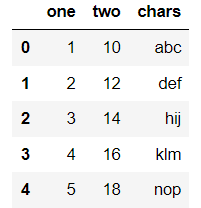 data = {'one': [1,2,3,4,5], 'two': [10, 12, 14, 16,18], 'chars': ['abc', 'def', 'hij', 'klm', 'nop']}