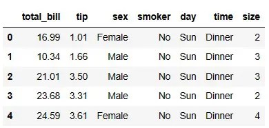 Below is a screenshot of the first few rows of the tips dataset, as produced by the head() function.