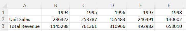 Now we want a column for Unit Sales and a column for Total Revenue with the years in a column at the left.