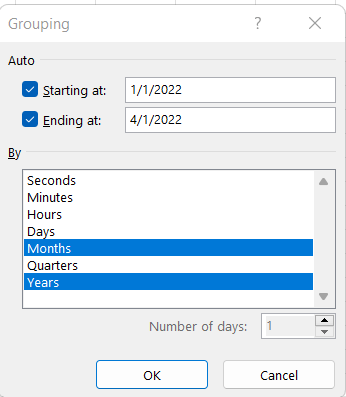 If this is fine for you and its all you’ll need from this data, then you can leave it as is and perhaps create a chart to go with it and carry on. However, there is a better, more flexible way. Also know that you can re-group the dates by selecting a month (as Feb is selected in the diagram) and right-click and choose Group or Ungroup. This may work fine for you. If you choose Group… you get the following dialog box.