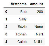 'amount': [200, '', None, 'NaN', 'NULL']}