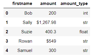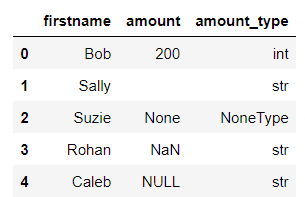 # add a column to the DataFrame df['amount_type'] = df['amount'].apply(lambda x: type(x).__name__) df