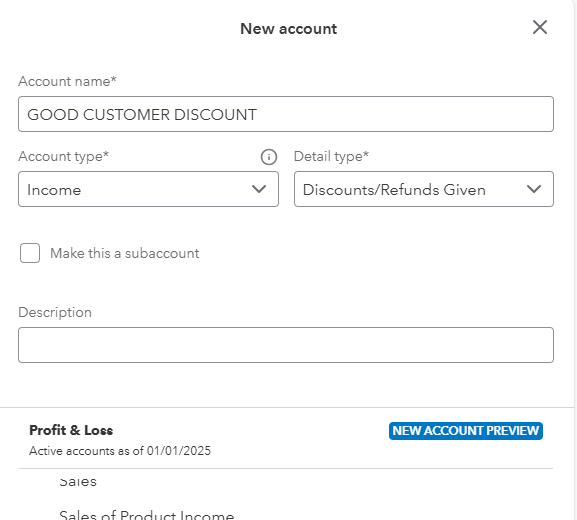 You can have a separate account in the chart of accounts to track the amount of each type of discount that you give. For example, you could have one account for employee discounts, one for Back-to-school discounts, one for end-of the -season discounts and so on. the account type you choose to track these discounts is called an income type of account, and the detail type is specifically discounts and refunds given.