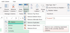 Create a new query by creating a Refernce to titleGenres. Rename it to Genres. Delete the tconst column. Remove Duplicates in the remaining Genre column as shown below in the screenshot.