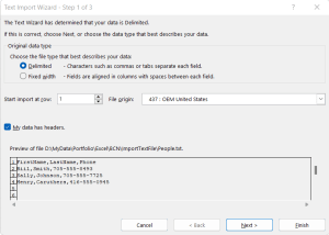 Below is a screenshot of our text file. This file People.txt was opened in Notepad++ and a screenshot was taken with Microsoft’s Snipping Tool.In an Excel file, go to the Data tab and click From Text/CSV. Navigate to your text file and select it. Click the Import button. You will see something similar to the screenshot below.