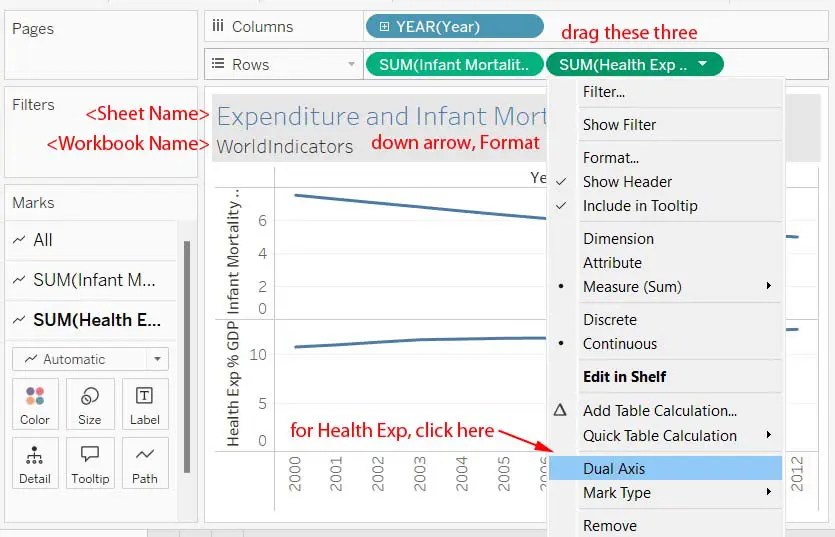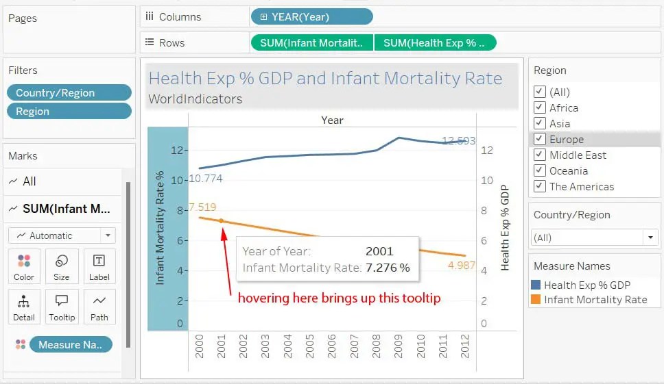 Here is an example of a line chart using Tableau’s World Indicators dataset. World Indicators come packaged with Tableau. You are wondering about the relationship between infant mortality and a country’s health expenditure as a percentage of GDP. Later, you might want to do that same analysis with health expenditure per capita. Click the screen shot below to enlarge it. I have added some comments in red. In Tableau, I set it to Fit Width instead of Standard in the top axis.