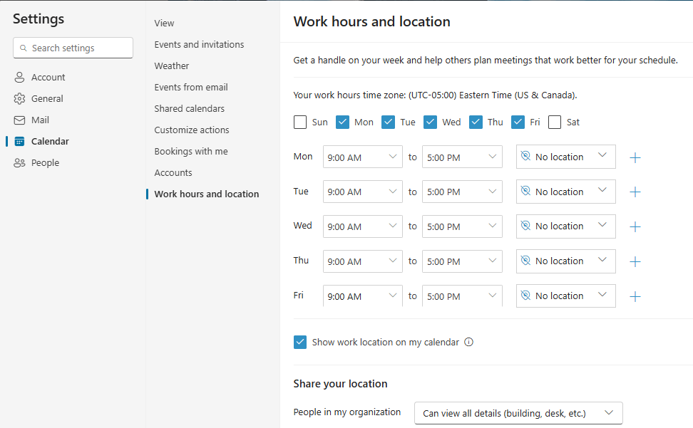 In your Outlook Calendar, the first thing you could do is set your working days and hours. Here below is a screenshot of Settings. I changed the hours from an 8 am start to a 9 am start.