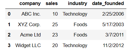 data = {'company': ['ABC Inc.', 'XYZ Corp.', 'Acme Ltd', 'Widget LLC'],