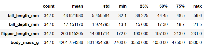 penguins.describe().T # the dot T transposes the output