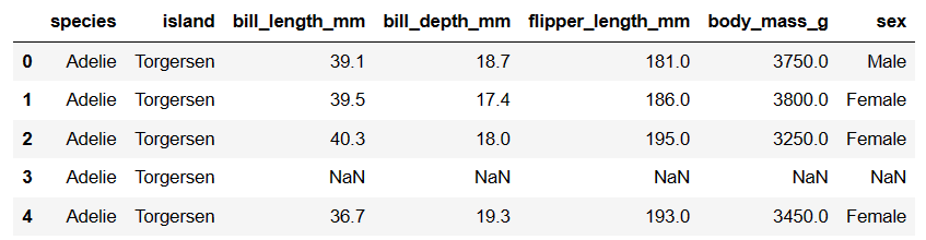<class 'pandas.core.frame.DataFrame'> RangeIndex: 344 entries, 0 to 343 Data columns (total 7 columns): # Column Non-Null Count Dtype --- ------ -------------- ----- 0 species 344 non-null object 1 island 344 non-null object 2 bill_length_mm 342 non-null float64 3 bill_depth_mm 342 non-null float64 4 flipper_length_mm 342 non-null float64 5 body_mass_g 342 non-null float64 6 sex 333 non-null object dtypes: float64(4), object(3) memory usage: 18.9+ KB