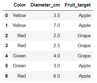 We are trying to predict whether the fruit in question is an apple or a grape based on the color and the size. We have some data in a CSV file that has a color column, a size column in cm and a column called fruit that identifies the actual type of fruit. If we were to have more data that did not identify the type of fruit, but did have the color and size, how well could we identify unknown fruits. It sounds fairly simple, but crab apples can actually be smaller than large grapes. Both apples and grapes can be green or red.