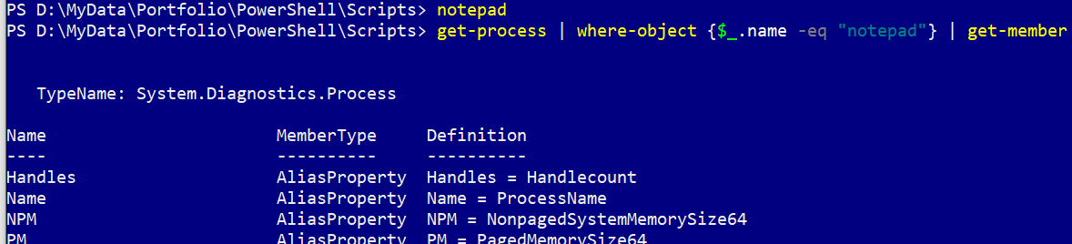 Suppose I had Notepad running. Let’s run get-process. Let’s filter that to just look at the Notepad process. What do we get in return? We get the object, not just text. To prove that, run the following commands. Here is the partial screenshot od a session. Click the picture to see a larger image.