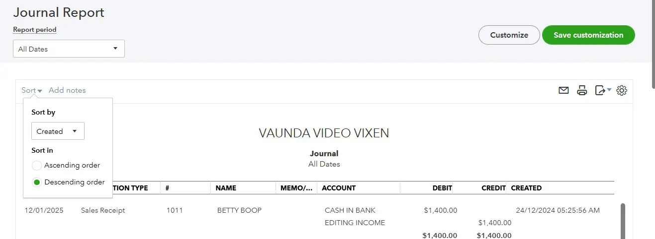 We’ll now add the Created column. Click the Cog Wheel in the upper left of the report. Click Show More and click the Created check box. All you have to do is click on a white space to complete the customization. You will likely want to immediately sort by the column you just added. At the top left, click Sort. Choose Created. Choose descending (most recent first). What does created mean? It is the “real=life” date that the journal entry was made. If you sort the created column by the most recent first, you can see exactly where you left off when you entering several transactions.