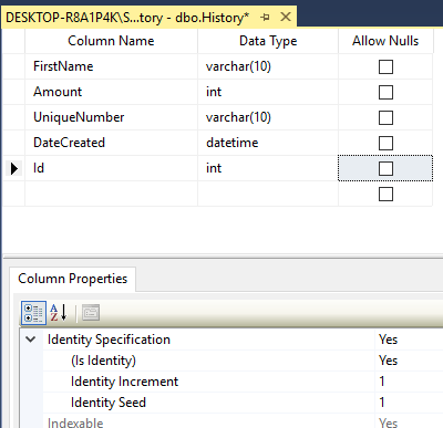 While we are on this topic we can also add an sequence number column to our History table that increments by one and starts with one. Here is the screen shot of SQL Server in the Table Design mode again.