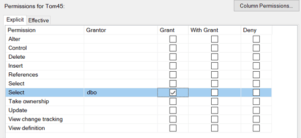 As you can see from the screen shot below there are several options when defining table permission. In the diagram we have given Tom45 the permission to read the table. He has permission to real ALL of the columns in the table. We can restrict him to only reading some of the columns in a table if we need to. He for example may be looking at a list of employees for which he is not allowed to see their salary or social insurance number. We can achieve this by un-selecting the check mark and clicking on the button Column Permissions and selecting Grant for the column we want the person to see.