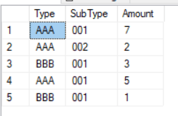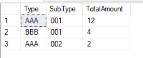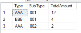 select [Type], [SubType], sum([Amount]) as TotalAmount from [dbo].[GroupBySumTwo] group by [Type], [SubType]