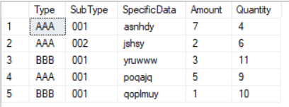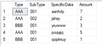 select [Type], [SubType], [SpecificData], sum([Amount]) as TotalAmount from [dbo].[GroupBySumTwo] group by [Type], [SubType]