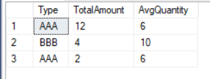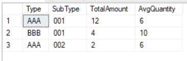 select [Type], sum([Amount]) as TotalAmount, avg([Quantity]) as AvgQuantity from [dbo].[GroupBySumThree] group by [Type], [SubType]