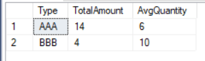 select [Type], sum([Amount]) as TotalAmount, avg([Quantity]) as AvgQuantity from [dbo].[GroupBySumThree] group by [Type]