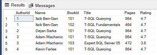 create database AuthorsBooks1 go use AuthorsBooks1 create table Authors( [AuthorId] int NOT NULL, [Name] varchar (20) NOT NULL CONSTRAINT [PK_Authors] PRIMARY KEY CLUSTERED ([AuthorId] ASC) ) create table Books( [BookId] int NOT NULL, [Name] varchar (20) NOT NULL, [Rating] [real] NULL, [Pages] [int] NULL CONSTRAINT [PK_Books] PRIMARY KEY CLUSTERED ([BookId] ASC) ) create table Link( [AuthorId] int NOT NULL, [BookId] int NOT NULL CONSTRAINT [PK_AuthorBooks] PRIMARY KEY CLUSTERED ([AuthorId] ASC,[BookId] ASC) ) INSERT [dbo].[Authors] ([AuthorId], [Name]) VALUES (1, N'Itzik Ben-Gan') INSERT [dbo].[Authors] ([AuthorId], [Name]) VALUES (2, N'Dejan Sarka') INSERT [dbo].[Authors] ([AuthorId], [Name]) VALUES (3, N'Adam Machanic') INSERT [dbo].[Authors] ([AuthorId], [Name]) VALUES (4, N'Kevin Farlee') INSERT [dbo].[Authors] ([AuthorId], [Name]) VALUES (5, N'Hugo Cornelius') GO INSERT [dbo].[Books] ([BookId], [Name], [Rating], [Pages]) VALUES (101, N'T-SQL Querying', 4.7, 864) INSERT [dbo].[Books] ([BookId], [Name], [Rating], [Pages]) VALUES (102, N'T-SQL Fundamentals', 4.7, 464) INSERT [dbo].[Books] ([BookId], [Name], [Rating], [Pages]) VALUES (103, N'Expert SQL Server 05', 3.8, 472) GO INSERT [dbo].[Link] ([AuthorId], [BookId]) VALUES (1, 101) INSERT [dbo].[Link] ([AuthorId], [BookId]) VALUES (1, 102) INSERT [dbo].[Link] ([AuthorId], [BookId]) VALUES (2, 101) INSERT [dbo].[Link] ([AuthorId], [BookId]) VALUES (3, 101) INSERT [dbo].[Link] ([AuthorId], [BookId]) VALUES (3, 103) INSERT [dbo].[Link] ([AuthorId], [BookId]) VALUES (4, 101) GO