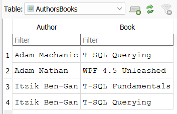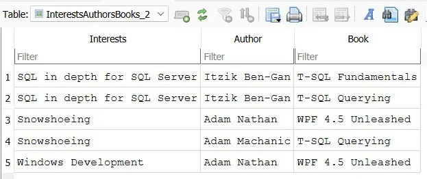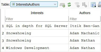 CREATE TABLE Authors( [AuthorId] INTEGER PRIMARY KEY, [AName] TEXT NOT NULL ); CREATE TABLE Books( [BookId] INTEGER PRIMARY KEY, [BName] TEXT NOT NULL ); CREATE TABLE LinkAuthorsBooks( [AuthorId] INTEGER NOT NULL, [BookId] INTEGER NOT NULL, FOREIGN KEY(AuthorId) REFERENCES Authors(AuthorId), FOREIGN KEY (BookId) REFERENCES Books(BookId) ); CREATE TABLE Interests ( InterestsId INTEGER PRIMARY KEY, IName TEXT); CREATE TABLE LinkInterestAuthor( InterestId INTEGER NOT NULL, AuthorId INTEGER NOT NULL, FOREIGN KEY(InterestId) REFERENCES Interests(InterestsId), FOREIGN KEY(AuthorId) REFERENCES Authors(AuthorId) ); INSERT INTO Authors (AuthorId, AName) VALUES (1, 'Itzik Ben-Gan'); INSERT INTO Authors (AuthorId, AName) VALUES (2, 'Adam Nathan'); INSERT INTO Authors (AuthorId, AName) VALUES (3, 'Adam Machanic'); INSERT INTO Books (BookId, BName) VALUES (1, 'T-SQL Fundamentals'); INSERT INTO Books (BookId, BName) VALUES (2, 'WPF 4.5 Unleashed'); INSERT INTO Books (BookId, BName) VALUES (3, 'T-SQL Querying'); INSERT INTO LinkAuthorsBooks (AuthorId, BookId) VALUES (1, 1); INSERT INTO LinkAuthorsBooks (AuthorId, BookId) VALUES (2, 2); INSERT INTO LinkAuthorsBooks (AuthorId, BookId) VALUES (1, 3); INSERT INTO LinkAuthorsBooks (AuthorId, BookId) VALUES (3, 3); INSERT INTO Interests (InterestsId,IName) VALUES (1,'SQL in depth for SQL Server'); INSERT INTO Interests (InterestsId,IName) VALUES (2,'Snowshoeing'); INSERT INTO Interests (InterestsId,IName) VALUES (3,'Windows Development'); INSERT INTO LinkInterestAuthor (InterestId, AuthorId) VALUES (1,1); INSERT INTO LinkInterestAuthor (InterestId, AuthorId) VALUES (2,3); INSERT INTO LinkInterestAuthor (InterestId, AuthorId) VALUES (2,2); INSERT INTO LinkInterestAuthor (InterestId, AuthorId) VALUES (3,2); CREATE VIEW AuthorsBooks AS SELECT Authors.AName AS 'Author', Books.BName AS 'Book' FROM Authors LEFT JOIN LinkAuthorsBooks ON Authors.AuthorId = LinkAuthorsBooks.AuthorId JOIN Books ON Books.BookId = LinkAuthorsBooks.BookId ORDER BY Authors.AName; CREATE VIEW InterestsAuthors AS SELECT Interests.IName AS 'Interests', Authors.AName AS 'Authors' FROM Interests LEFT JOIN LinkInterestAuthor ON Interests.InterestsId = LinkInterestAuthor.InterestId JOIN Authors ON Authors.AuthorId = LinkInterestAuthor.AuthorId ORDER BY Interests.IName;