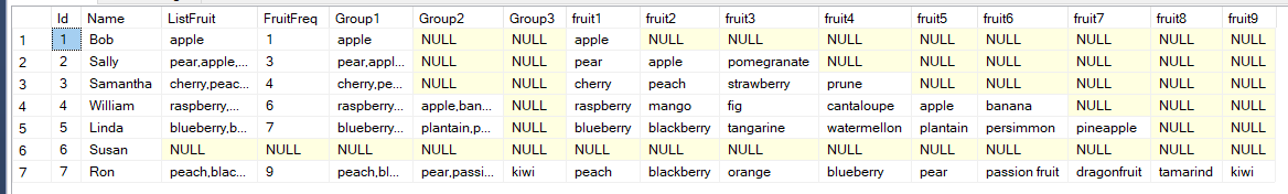 Below is the code to add the new columns. Each fruit must ultimately be in its own column, and since we have the largest string that has nine fruits, we need nine new columns. If a string has less than nine fruits, and many do, NULL will be the value of those columns above the number of fruits in the string.