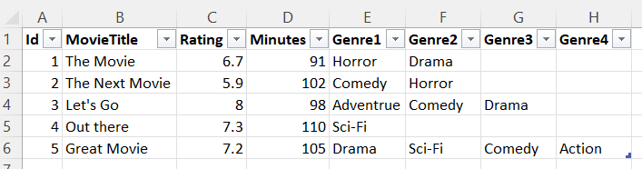 Let’s look at the second example mentioned at the top of the post. Here we have products and the categories they belong to where aech product, movie, actually belongs to multiple categories or genres. The unpivot works in a similar way here as it did in the previous example. Below is a screenshot of the raw data.